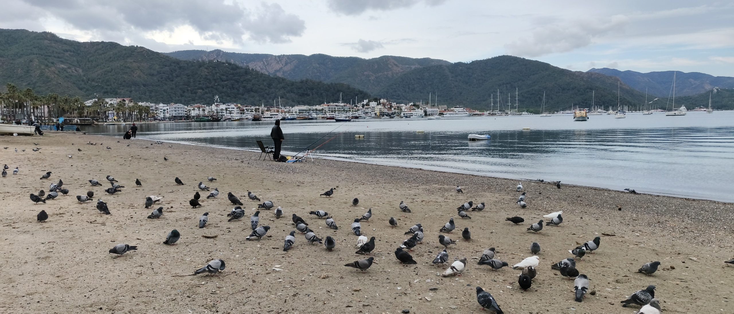 Sahili terk etmemesi için vatandaşlar tarafından beslenen güvercinler kış döneminde hem sahilin keyfini yaşıyor hem de Marmaris’in güzelliğine güzellik katıyor.